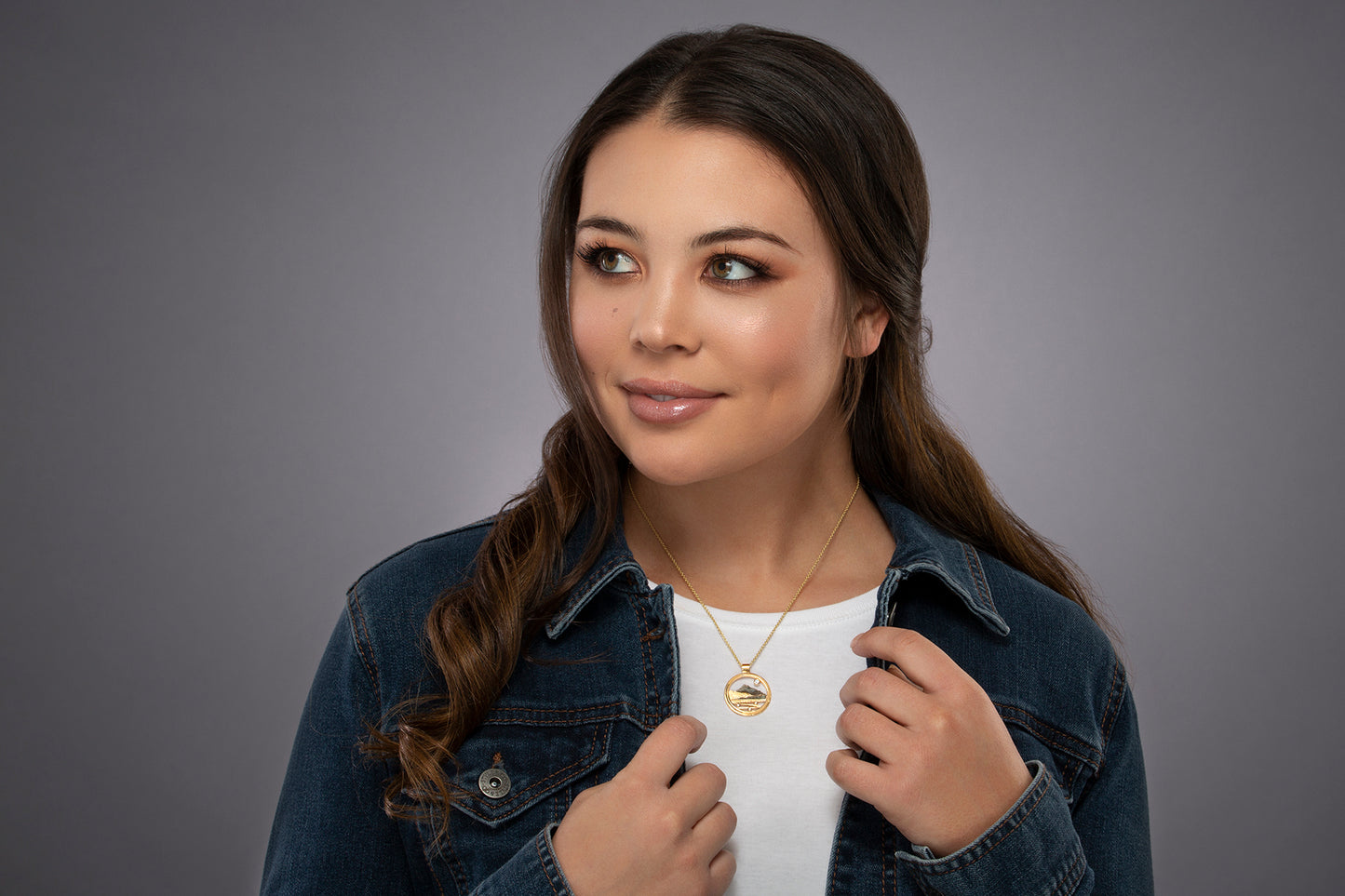 18k yellow gold 22mm pendant with .20 carat diamond with complimentary gold plated 1.5mm cable chain.